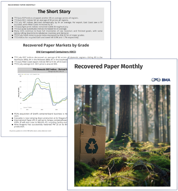 Monthly-updated, open-market, transactions-based, net-price indices for Mixed Paper (MP), Old Corrugated Containers (OCC), Sorted Office Paper (SOP), Light Print (LP), and Pulp Substitutes.